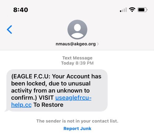 We have received reports that some customers have received text messages similar to the item below. Even though the link doesn’t look like anything Sky Bridge Bank related, it lands on a page that was scraped from our Online Banking main page.